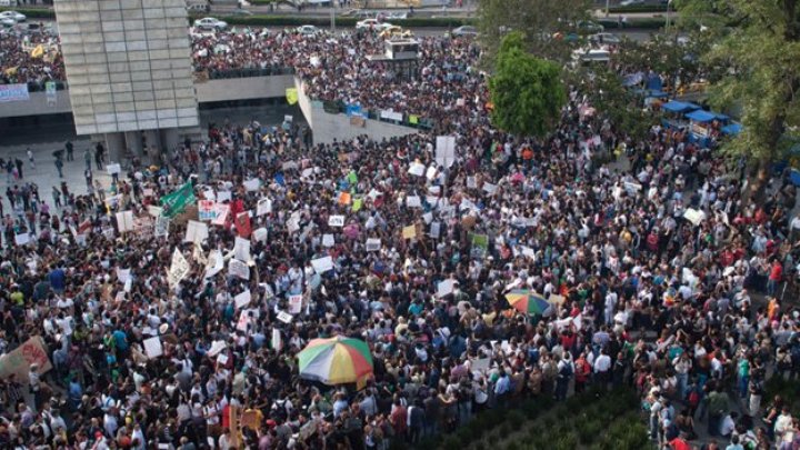 NOTICIAS 23/05/2012Marcha #YoSoy132 se divide, unos van al Zócalo y otros más a las instalaciones de Televisa ChapultepecMiles de jóvenes ocupan desde la explanada del monumento Estela de Luz al Ángel de la Independencia en el centro de la Ciudad de México para manifestarse por la "democratización de los medios" y "exigir un proceso electoral transparente y claro".