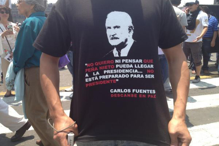 NOTICIAS 19/05/2012Carlos Fuentes se hace presente mediante playeras y frases en la marcha Anti-Peña Nieto en el DFLa marcha que se encuetra realizando en este momento en la capital mexicana la cual fue convocada mediante el poder de las redes sociales y a la que nombraron #MarchaAntiPeñaNieto se encuentra integrada tanto por jóvenes como por adultos que han sacado pantacartas, fotos y diversos objetos que recuerdan presidentes, gobernadores o personajes anteriores del priísmo.