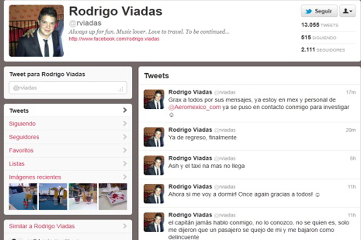 NOTICIAS 19/03/2012Joven denuncia discriminación en aerolínea por ser homosexualDespués de haber sido bajado de un avión, Rodrigo Viadas, hizo pública su inconformidad en Twitter, inconformidad que en poco tiempo se convirtió en Trend Topic.