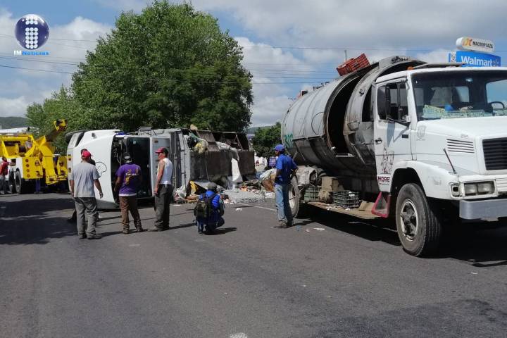 Varias contusiones padecieron los tres ocupantes de un camión recolector de basura, propiedad del Ayuntamiento de Morelia, esto tras volcar sobre el Periférico Paseo de la República, frente a la Macroplaza Estadio.