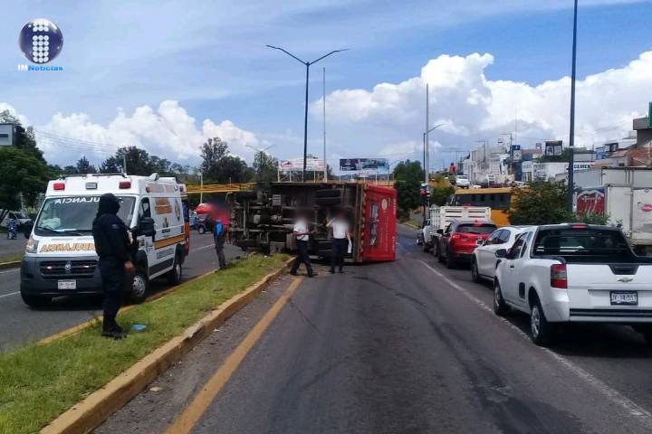 Un camión de la empresa Coca-Cola acabó volcado sobre uno de los camellones de la avenida Madero Oriente, también conocida como la salida a Charo, accidente que dejó un herido leve, trascendió en la labor reporteril.