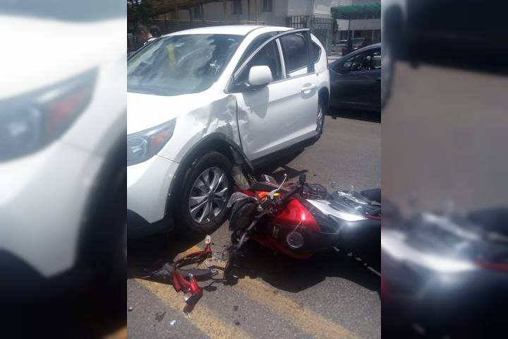 Un automóvil y una motocicleta protagonizaron un choque sobre la avenida Madero Poniente de la ciudad de Morelia, a consecuencia de ello el conductor de la moto quedó lesionado y unos policÃas municipales le otorgaron los primeros auxilios.