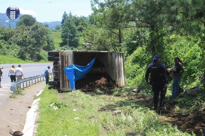 La tarde de este martes, se registró un aparatoso accidente de un camión tipo volteo, que, tras quedarse sin frenos, su conductor optó por salir a su derecha del camino y volcar sobre su costado derecho, desplazándose en el suelo más de cien metros; una pareja que viajaba en la unidad motriz, resultó con lesiones leves.