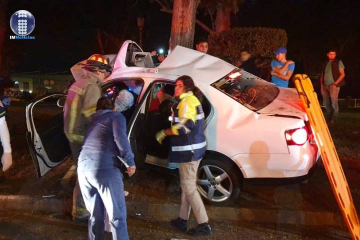 Cinco lesionados, tres de los cuales estaban prensados al interior de un vehículo, fue el saldo de un aparatoso choque contra un árbol, ocurrido esta madrugada en el municipio de Jacona.