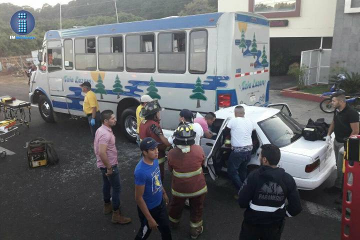 El chofer de un vehículo Tsuru resultó lesionado al quedar prensado en su unidad al colisionar por alcance contra un camión de la línea Tata Lázaro, se supo en la labor periodística.