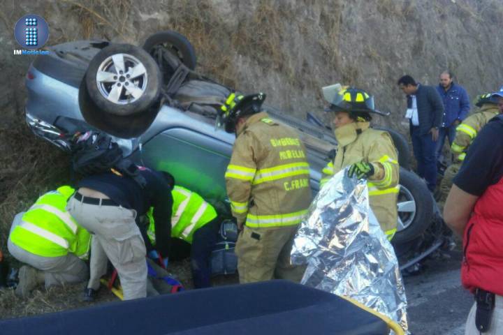 En la carretera Morelia-Mil Cumbres, a la altura del fraccionamiento Ana Sofía, un coche de la marca Renault Fluence, de color plata, volcó y quedó con el toldo contra el terreno.