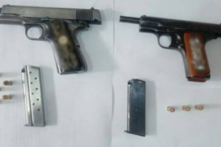 A José J. y José R., de 23 y 20 años de edad, respectivamente, se les decomisaron dos pistolas tipo escuadra, calibres .38 súper, y .9mm, con dos cargadores y ocho municiones.