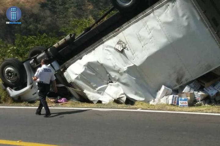 Bastante dañado terminó un camión de carga al volcar sobre la carretera Zitácuaro-Huetamo, percance que afortunadamente no dejó personas lesionadas, comunicó la Policía.