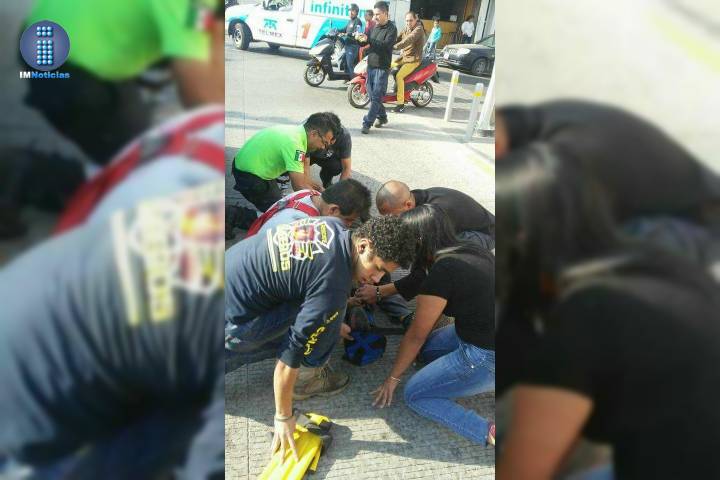 Un motociclista resultó lesionado al protagonizar su unidad un choque contra un automóvil, cuya conductora sufrió una crisis nerviosa, mencionaron contactos oficiales.