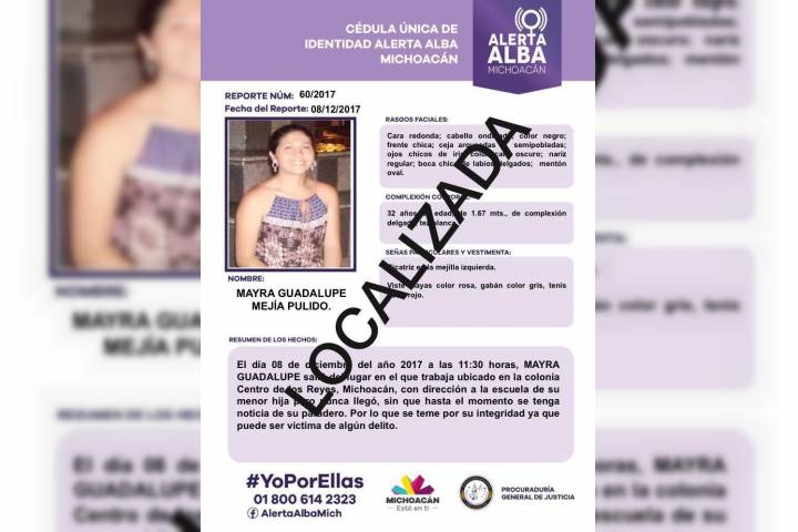 La Procuraduría General de Justicia del Estado (PGJE), a través de las fiscalías Regional y Especializada en Personas Desaparecidas, localizó a una mujer que el pasado viernes fue reportada desaparecida en el municipio de Los Reyes.