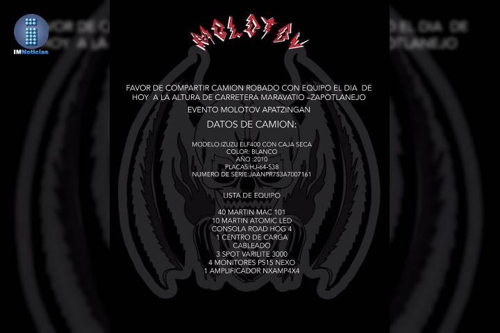 La banda de Rock Molotov publicó en su sitio oficial que su proveedor de iluminación Pro III Lightning fue asaltado en Maravatío.