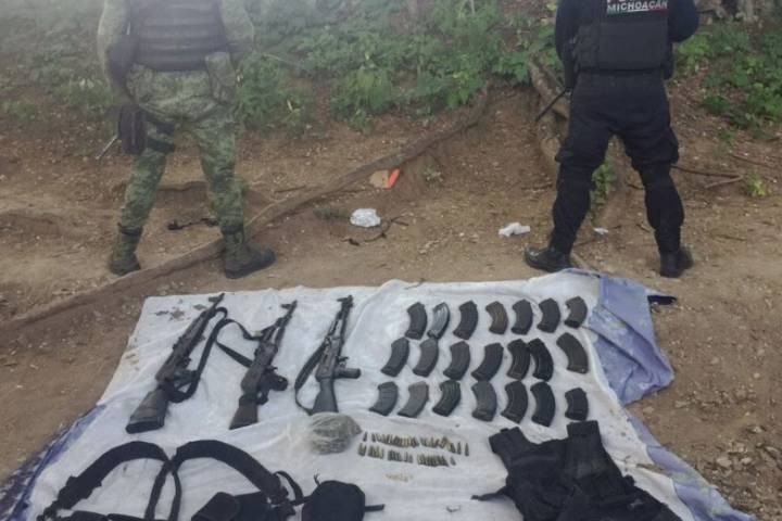 Elementos de la Policía Michoacán y del Ejército Mexicano desmantelaron un narcocampamento y aseguraron un arsenal que ahí se encontraba.