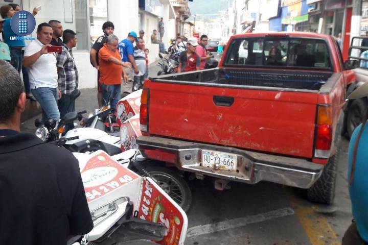 Un individuo, causó un aparatoso accidente en pleno centro de esta ciudad, al intentar en una camioneta circular en sentido contrario por la calle 16 de Septiembre, sin que por fortuna lesionara a nadie pero chocando contra otra unidad y derribando al menos 11 motocicletas que se encontraban estacionadas en el lugar.