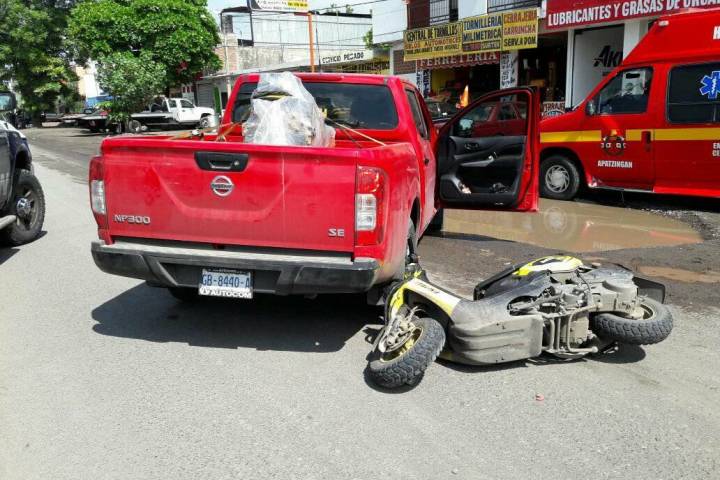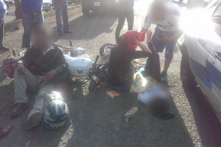 Dos adultos y una niña sufrieron varias contusiones cuando cayeron de manera brusca con todo y la motocicleta en la que viajaban sobre la Avenida Madero Poniente.