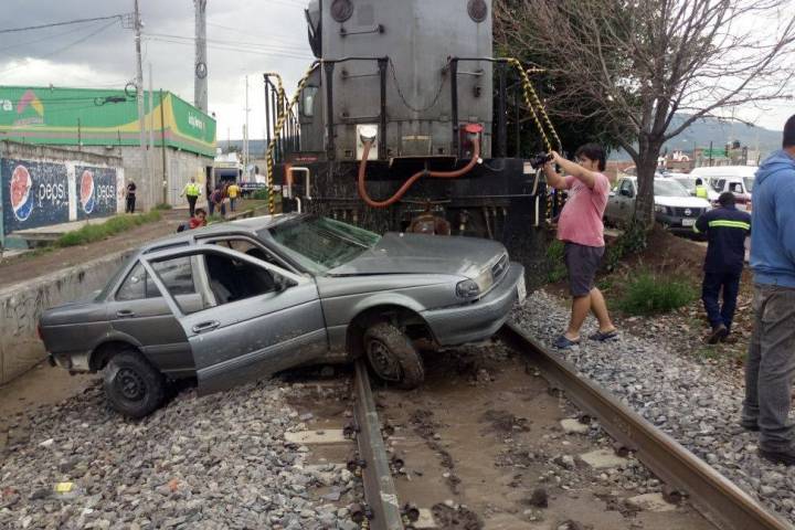 Amarga experiencia sufrió una mujer cuando su automóvil se le apagó al intentar atravesar las vías férreas, momento en el que el tren lo embistió y lo arrastró varios metros, explicaron las autoridades.