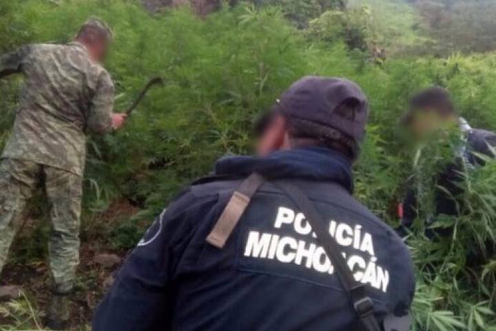 Durante un recorrido de prevención realizado pie a tierra, elementos de la Policía Michoacán y del Ejército Mexicano ubicaron cuatro plantíos de hierba verde con las car... Ver más...