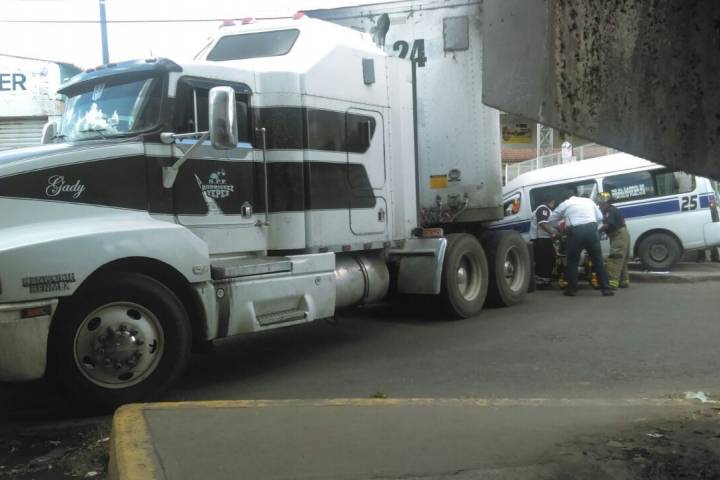 Una combi de la Ruta Morada se impactó contra un tráiler y quedó atorada en la caja de éste, el saldo fue de tres lesionados, según los datos brindados por las autoridades respectivas en el lugar de los hechos.