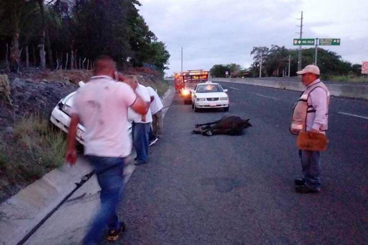 Un taxista resultó lesionado después de que con su unidad atropelló y mató a un caballo, el percance fue en la carretera federal Apatzingán-Nueva Italia, en este municipio.