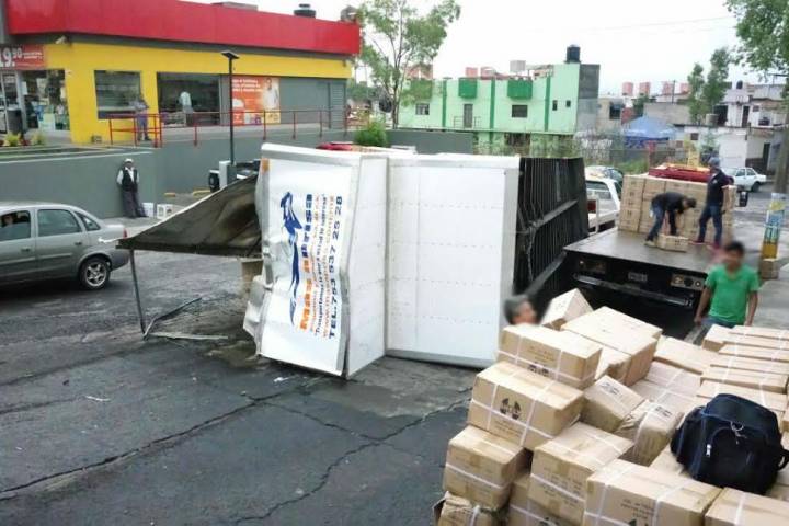 Dañada quedó la caja de un camión perteneciente a una empresa de paquetería, pues el peso que transportaba la hizo volcar al llegar a un desnivel de la lateral del Periférico República, esquina Avenida Mártires de la Plaza.