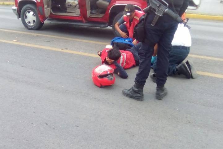 El conductor de una motocicleta resultó herido, luego que fuera atropellado por una veloz camioneta; por fortuna el afectado logró salvar la vida debido a que tenía puesto el casco protector.