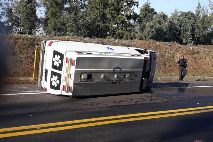 Una ambulancia que acaba de realizar un traslado a la ciudad de Morelia de un paciente enfermo volcó en la autopista "Siglo XXI", a raíz del accidente tres enfermeras y un paramédico que iban en ella resultaron lesionados.