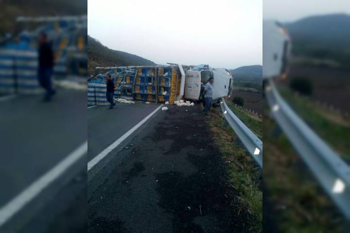 Un tráiler que llevaba un cargamento de pollos vivos volcó en el tramo carretero Cuitzeo-Panindícuaro de la Autopista de Occidente, a raíz del percance el chofer resultó ileso, refirieron contactos oficiales.