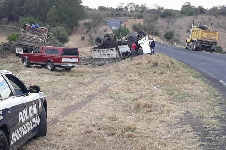 Un camión tipo volteo se accidentó en la carretera Morelia-Teremendo en esta demarcación y en ese lugar fue hallado abandonado. Los agentes de Tránsito del Estado acudieron a la zona para realizar los peritajes respectivos y ordenar que una grua remolcara la pesada unidad a un corralón.