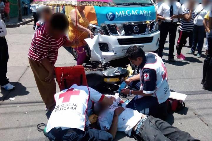 Paramédicos de la Cruz Roja (CR) auxiliaron a un motociclista repartidor de tortillas que resultó lesionado en un choque contra un vehículo de la empresa Megacable, según se conoció en el sitio del incidente.