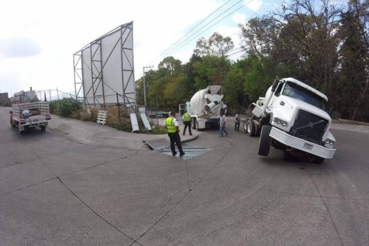 Con parte de la suspensión quebrada terminó un camión cargado con una revolvedora de concreto, hecho que estuvo a punto de provocar la volcadura de dicha unidad motriz sobre el camino hacia Santa María de Guido, comentó la Policía.