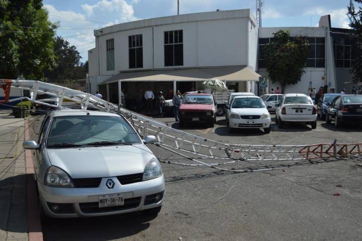 Una antena de transmisión de radio propiedad de la Procuraduría General de Justicia del Estado (PGJE) se vino abajo y cayó sobre un vehículo particular que estaba en el estacionamiento de dicha dependencia estatal, por fortuna no hubo heridos ni muertos.
