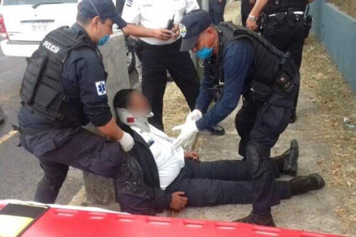 El suceso fue durante la tarde de este viernes, enfrente de una sucursal de Bancomer. El uniformado que quedó herido es Javier V., de 55 años de edad, mismo que tuvo una contusión torácica a consecuencia del percance.