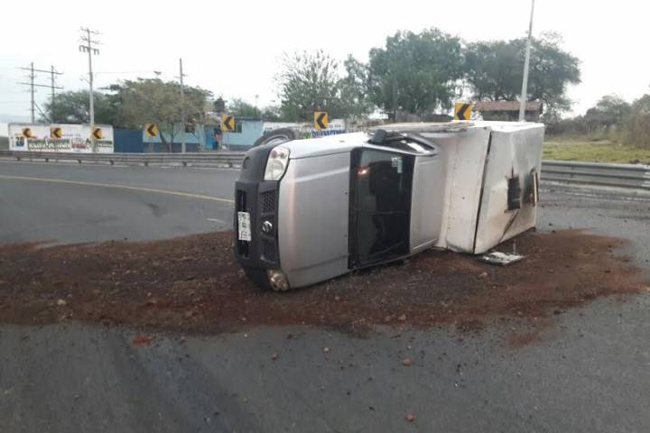 Una camioneta que trasladaba un cargamento de vino volcó en la carretera Morelia-Charo, en este municipio, accidente que dejó dos lesionados, según el reporte de la Policía.