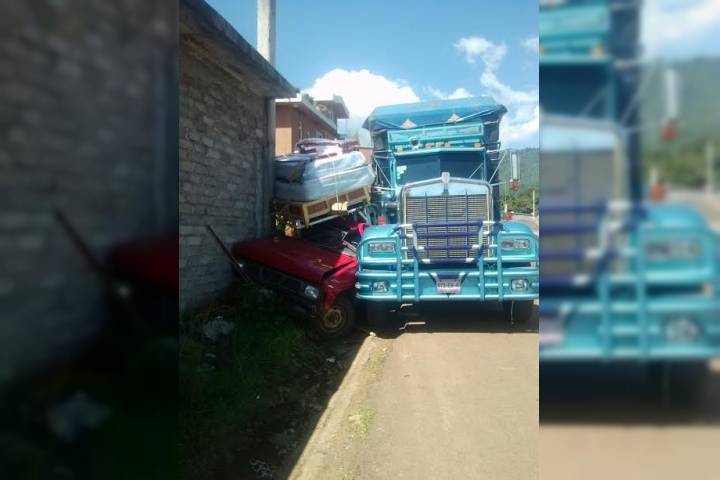 El conductor de una camioneta mueblera detuvo su trayecto para comer en una fonda, estacionó su unidad a una orilla del camino y mientras él probaba alimento su vehículo fue destrozado con todo y mercancía al estrellarse contra él un camión tipo torton.
