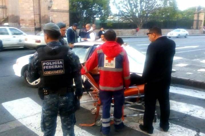 Dos taxis colisionaron en pleno corazón de esta ciudad de Morelia, frente a la Catedral, percance que dejó como saldo una pasajera herida levemente, según los cuerpos de auxilio.