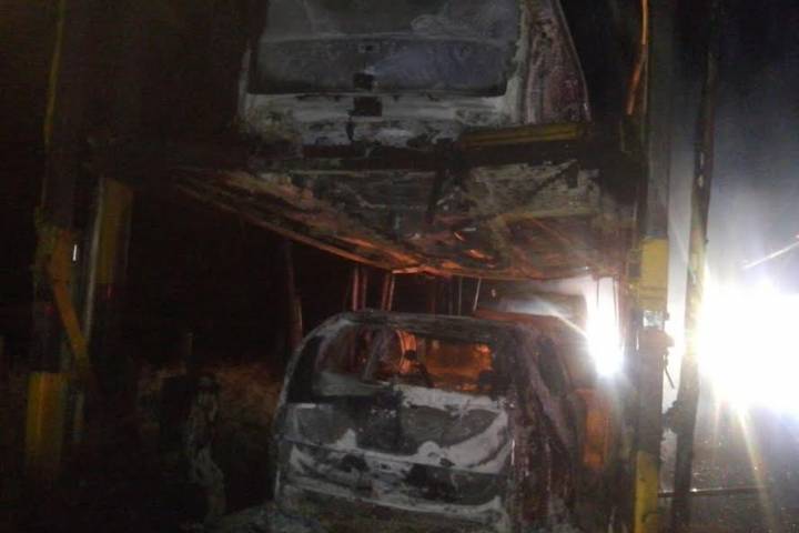 NOTICIAS 10/08/2016Se incendia un remolque de tráiler nodriza, arden 4 vehículos nuevos