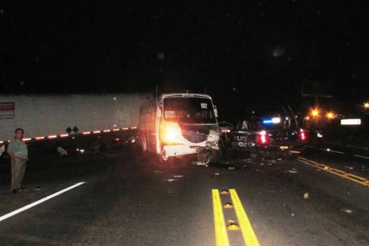 Seis policías lesionados y cuantiosos daos materiales fue el saldo de una carambola vehicular en la que participaron camión pasajero, un tráiler y una patrulla de la Policía Michoacán; según se conoció en el lugar de los hechos.