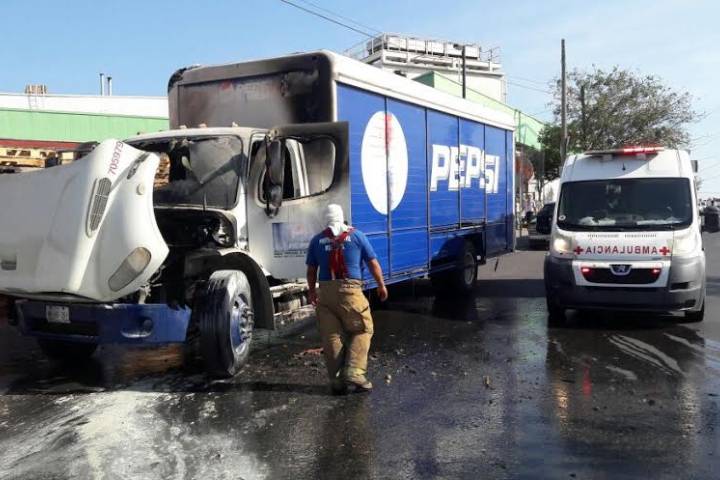 Un corto circuito ocasionó que un camión repartidor, propiedad de la Pepsi, se incendiara, por fortuna no hubo heridos.