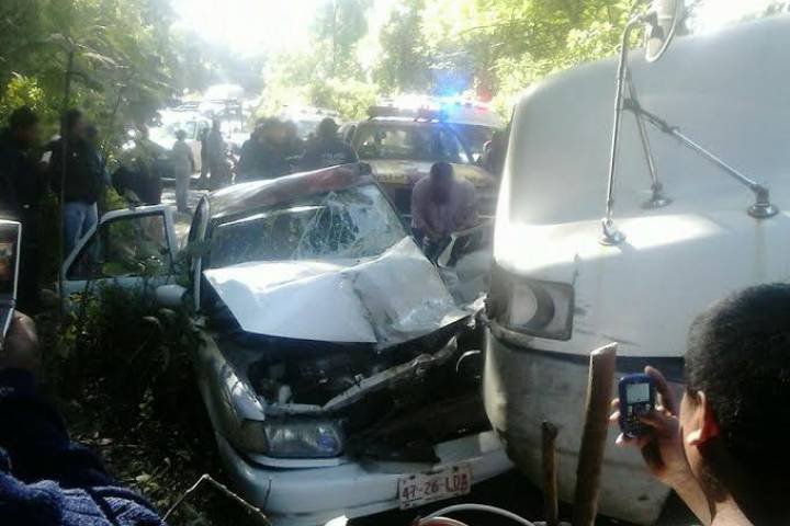 Un aparatoso choque de frente entre un vehículo de alquiler y un camión de redilas dejó dos lesionados: El taxista y su pasajera, quienes fueron atendidos por unos paramédicos para enseguida ser llevados a recibir atención médica, de acuerdo con la información recabada por esta agencia de noticias.