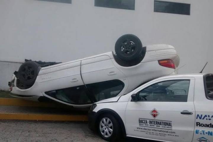 Un automóvil se salió del camino, impactó contra una banqueta y volcó, momento en que dañó dos camionetas que estaban estacionadas, propiedad de la empresa Dacza International. No hubo lesionados ni fallecidos, trascendió en la cobertura periodística.