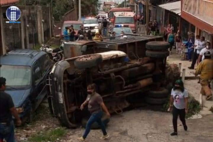 De acuerdo con datos obtenidos por este medio la unidad transitaba por la pendiente de la calle prolongación Jiménez cuando aparentemente fallaron los frenos y se fue de reversa hasta culminar volteada y bloquear la vialidad.