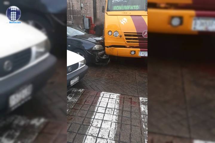 Un auto compacto y un camión del transporte público urbano estuvieron involucrados en un choque que ocurrió la mañana de este jueves en el Centro Histórico de Morelia.