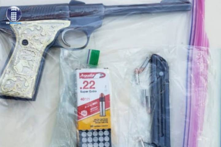 Agentes de la Policía Michoacán detuvieron a los implicados Manuel G., y Juana G., en posesión de un arma de fuego calibre .22 mm., cuando viajaban a bordo de un vehículo de la marca Nissan en la citada localidad.