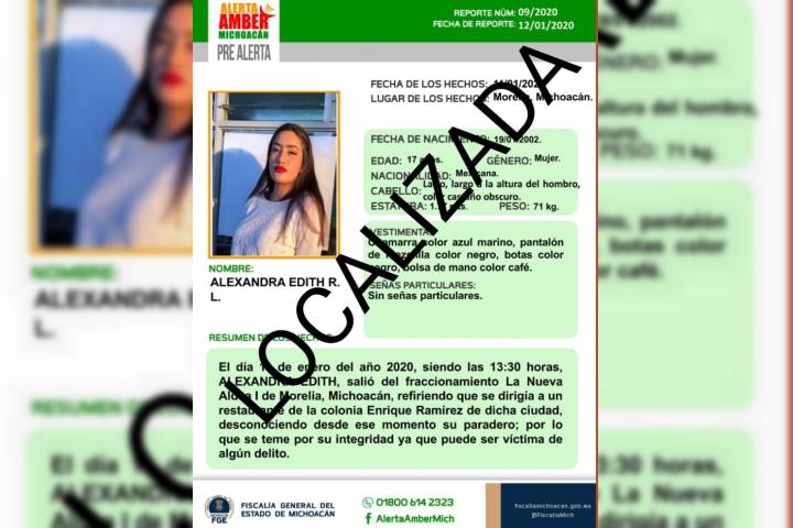 NOTICIAS 13/01/2020Localiza FGE a una adolescente reportada desaparecida en Morelia La Fiscalía General del Estado de Michoacán (FGE), localizó a una adolescente de 17 años de edad, que había sido reportada como desaparecida el pasado sábado, en esta ciudad.