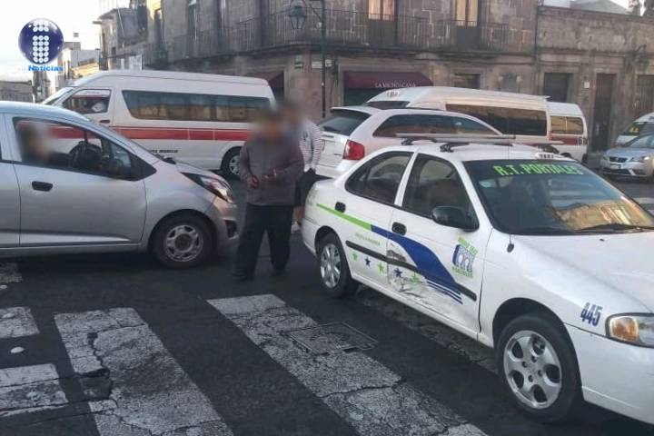 Dos vehículos, uno de ellos taxi, protagonizaron un choque sobre la avenida Madero Poniente, en el Centro Histórico de la ciudad de Morelia. Por fortuna no hubo lesionados, únicamente daños materiales, comentaron contactos de rescate.