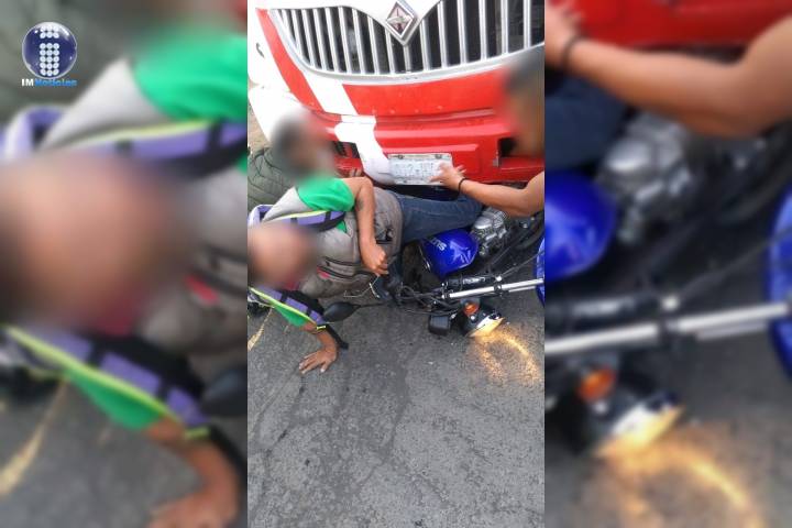 Un motociclista quedó lesionado cuando un camión de pasajeros lo atropelló sobre la avenida Madero Poniente; el afectado fue auxiliado por otros ciudadanos, asà como por vigilantes del Agrupamiento Tigre.