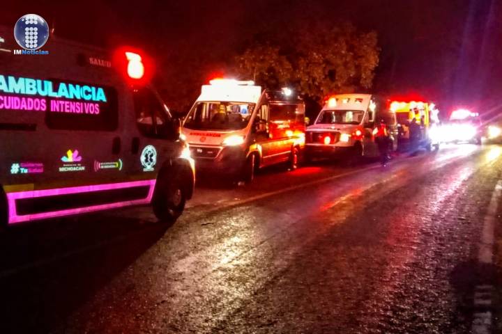 Un autobús de pasajeros de la lÃnea Coordinados volcó en la carretera Zacapu-Carapan en este municipio, lo cual dejó como saldo nueve lesionados, entre ellos un policÃa y un elemento de Rescate que iban como usuarios, según la información obtenida por este medio.