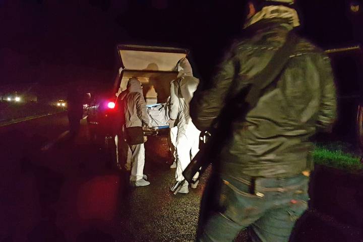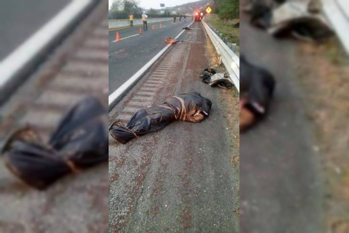 Uno de los cuerpos fue arrollado por un vehículo, por lo que sus restos quedaron esparcidos sobre la carpeta asfáltica.