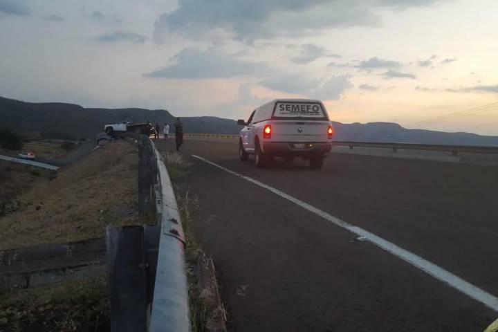 Domingo 08 de mayo de 2016.- Un vecino de la población de Cuitzeo perdió la existencia al volcar la camioneta que manejaba, la cual estuvo a punto de caer de un puente vehicular, quedó atorada en una banda de contención metálica.