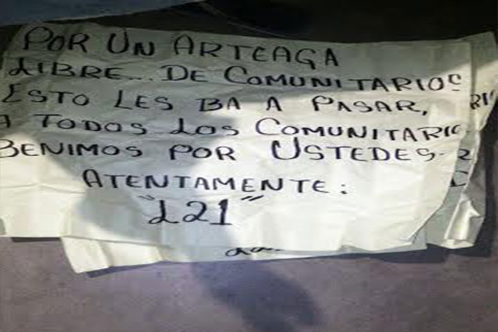 militar, salieron del inmueble y se retiraron con rumbo desconocido, no sin antes dejar unas cartulinas sobre el cuerpo de la víctima: un mensaje de muerte para los comunitarios, de acuerdo con los datos brindados por las autoridades polic... Ver más...