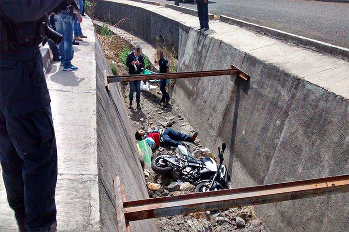 Un motociclista falleció al caer a un canal seco del drene pluvial ubicado en la Avenida América, a 100 metros de la caseta del fraccionamiento Metrópolis 2, perteneciente a esta demarcación. Al parecer el ahora finado se precipitó a dicho lugar luego de que derrapó tras evitar impactarse contra un camión de pasajeros de la ruta Alberca, el cual circuló en sentido contrario, según dijeron algunos testigos.